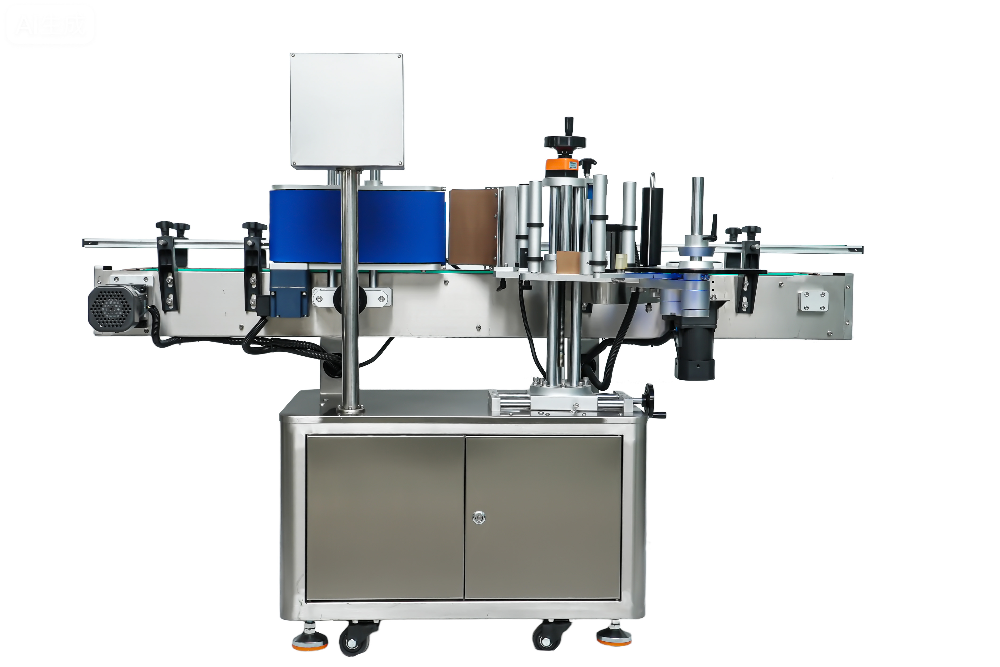 ◆操作過程:首先,產品被放置于輸送帶之上(此輸送帶可與生產線無縫銜接,實現生產流程的順暢銜接),隨后產品開始勻速輸送,接著進行產品位置檢測,確保產品處于正確的貼標位置。當位置確認無誤后,搓滾貼標機構開始動作,完成標簽剝離與搓滾貼附的關鍵步驟。之后,通過專門的裝置對標簽進行撫平操作,確保標簽與產品表面緊密貼合、牢固粘貼,最后收集已貼標產品,完成整個貼標流程。